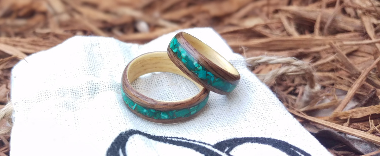 All of my rings are made with a bent wood technique that involves wrapping thin layers of wood around itself. This process results in a strong, durable ring that’s incredibly lightweight. When I say these rings are hand-made, I mean truly made by hand. The whole process from bending all the way through to finishing is done with meticulous care and without the use of any power tools. Even the rocks in the stone inlays are crushed by hand. The only exception to this are the rings with stainless steel cores. Grinding steel with hand tools? That’s just crazy talk.